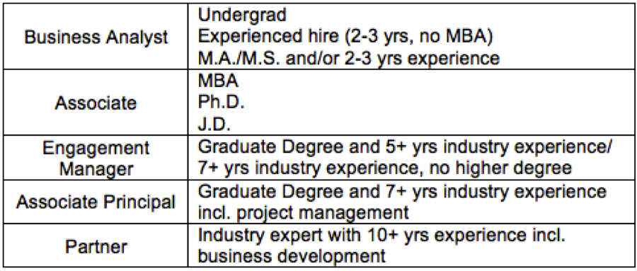 If you're applying as an undergrad or non-MBA, you'll be competing for a position as a Business Analyst. Only advanced degree professionals can move directly into an Associate role - otherwise, you need to go train up (get your Stanford MBA or Harvard JD). McKinsey sponsors graduate programs for top performers, and they trade year-for-year - 1 year of academic work to 1 year of indentured servitude (paid at really nice salaries - see our Salaries Report for details).